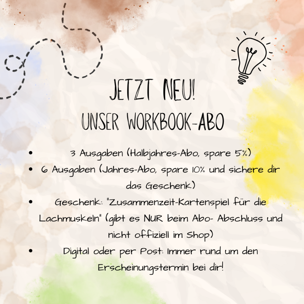 Wer kennt es nicht – man möchte seinem Kind eine schnelle Spielidee anbieten, hat aber keine zündende Idee? Die brauchst du jetzt auch nicht mehr, denn in unseren Workbooks, von denen alle zwei Monate eine neue Ausgabe erscheint, findest du viele Inspirationen und Ideen, sowie pädagogischen Input. Jedes Workbook hat rund 60 Seiten und nochmal rund 20 Seiten Zusatzmaterial. In allen Ausgaben bekommst du ganz viele Ideen und Inspirationen rund um die Titel-Themen und alles, was in diesen beiden Monaten des Jahres so ansteht. Ab jetzt kannst du dich alle 2 Monate auf eine neue Ausgabe freuen, die deine Familie und dich mit Spiel, Spaß und ganz viel “Zusammenzeit” durch die Monate begleitet. Glaub’ mir – du hast für alle Aktivitäten sicherlich schon alles zu Hause und so wie du uns kennst, sind alle Aktivitäten simpel gehalten, so dass du sie prima in euren Alltag integrieren kannst.